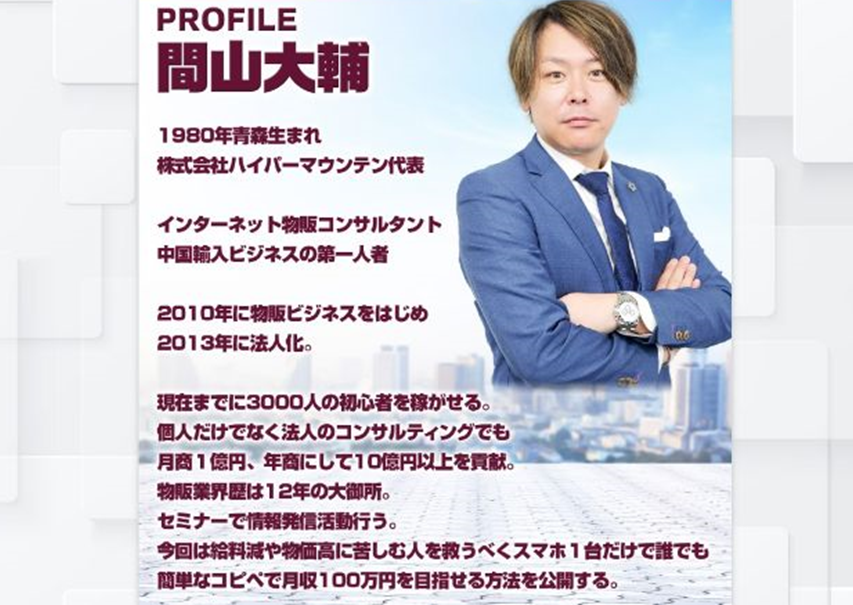 ランディングページ(LP)では、この秘密のサイト『月収100万円勝ち確定サイト』の開発者の間山大輔と言う人物の名前が出てきました。